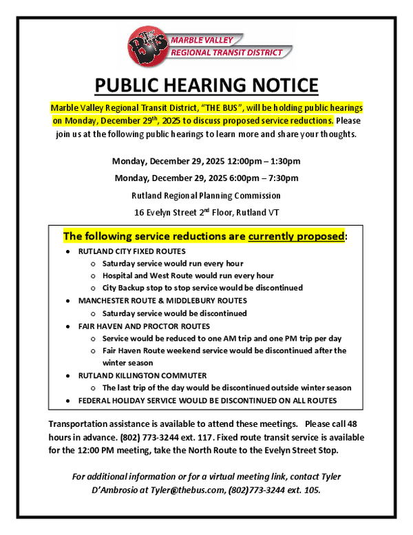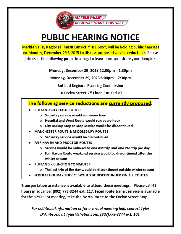The Marble Valley Regional Transit District (MVRTD) 'The Bus' has notified the Town of (2) upcoming public hearings on December 29, 2025, to discuss proposed service reductions. Please see the attached Public Hearing Notice for further details and for an outline of the proposed reductions. Please visit the MVRTD website for further information: Rutland Public Transportation | Paratransit & Daily Services | The Bus
